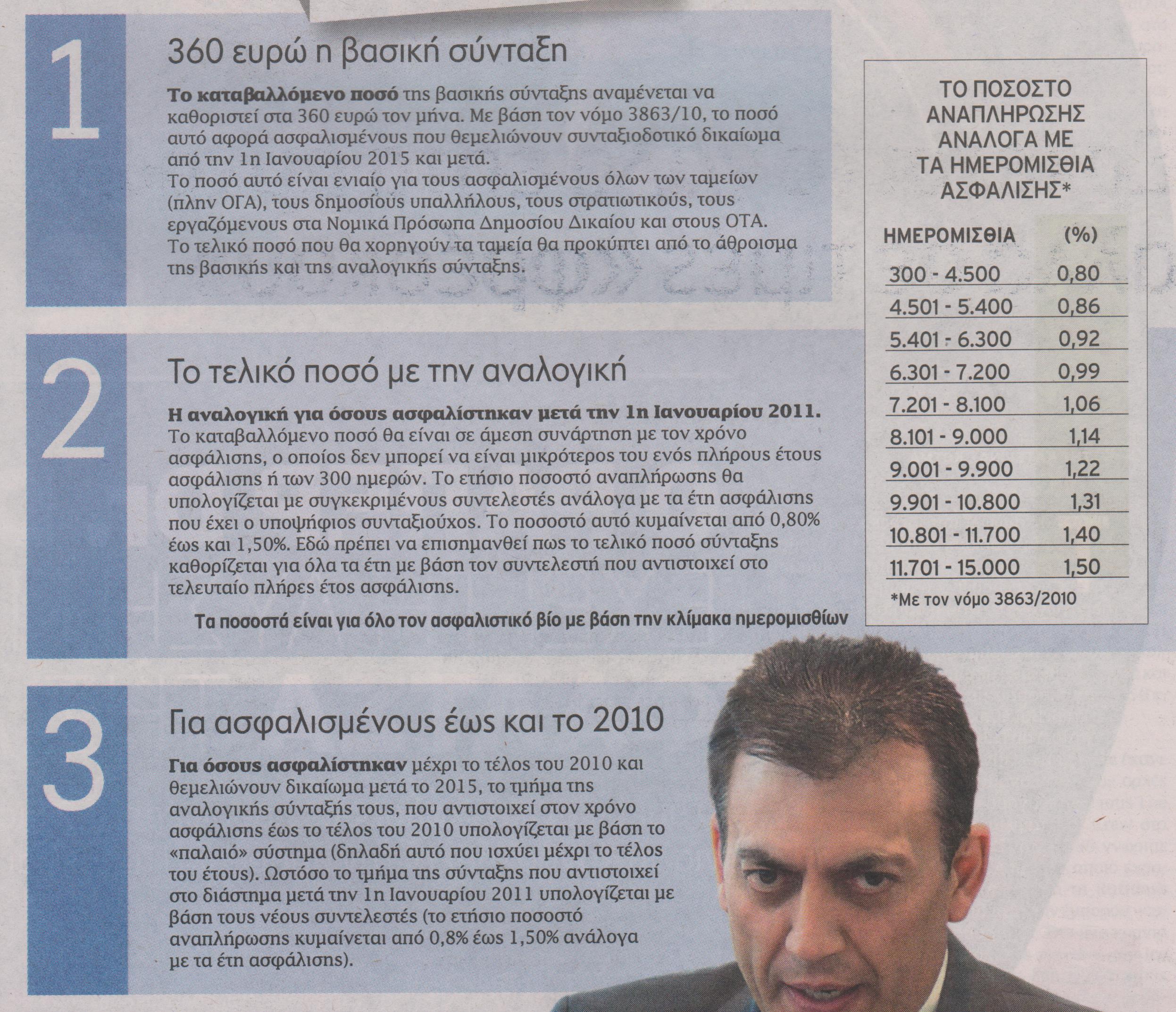 Με νέο τρόπο θα υπολογίζονται οι συντάξεις στο Δημόσιο και σε όλα τα Ταμεία από την 1η Ιανουαρίου 2015 και για τον σκοπό αυτό συγκροτείται επιτροπή στο υπουργείο Εργασίας. Σημειώνεται πως η αλλαγή στον τρόπο υπολογισμού των συντάξεων προβλέπεται στον νόμο 3863, που ψηφίστηκε το 2010 αλλά θα εφαρμοστεί από την επόμενη χρονιά.