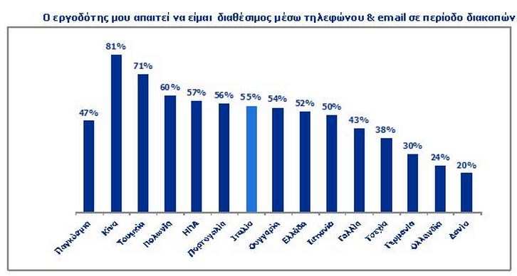 Το 52% των ερωτηθέντων δήλωσε ότι ο εργοδότης τους περιμένει από εκείνους να είναι διαθέσιμοι και κατά τη διάρκεια των διακοπών τους στο τηλέφωνο ή να απαντούν σε email.