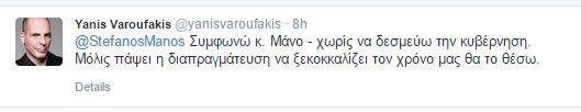 Ο κ.Βαρουφάκης απάντησε τα εξής: «Συμφωνώ κ. Μάνο – χωρίς να δεσμεύω την κυβέρνηση. Μόλις πάψει η διαπραγμάτευση να ξεκοκαλίζει τον χρόνο μας θα το θέσω».