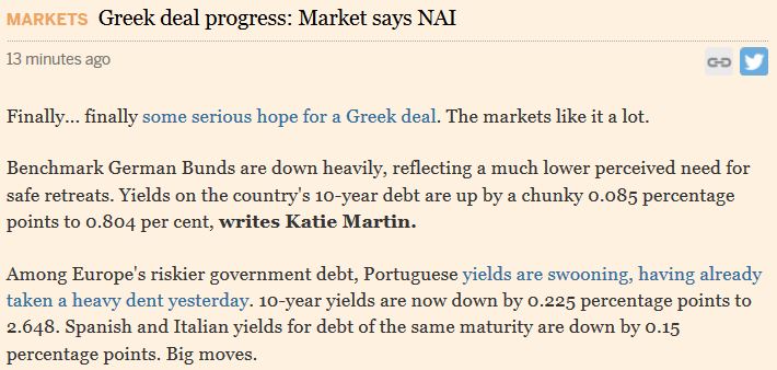 Οι αγορές ψηφίζουν “ΝΑΙ” στην πρόταση της ελληνικής κυβέρνησης ανοίγοντας δρόμο για συμφωνία με τους δανειστές.