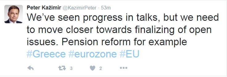 “Υπάρχει πρόοδος στις συνομιλίες, ωστόσο πρέπει να προχωρήσουμε πιο κοντά στην ολοκλήρωση των ανοιχτών θεμάτων. Στη μεταρρύθμιση του ασφαλιστικού, για παράδειγμα”, έγραψε στο λογαριασμό του στο Twitter ο Σλοβάκος υπουργός Οικονομικών.