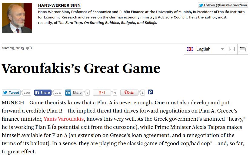 Στο ιδιότυπο παιχνίδι νεύρων στα σκληρά παζάρια Ελλάδας δανειστών, ο Αλέξης Τσίπρας κάνει τον «καλό» που θέλει τη συμφωνία το Σχέδιο Α’, ενώ ο Γ. Βαρουφάκης κάνει τον «κακό» που θέλει την ρήξη, ισχυρίζεται ο Χανς Βέρνερ Ζιν.