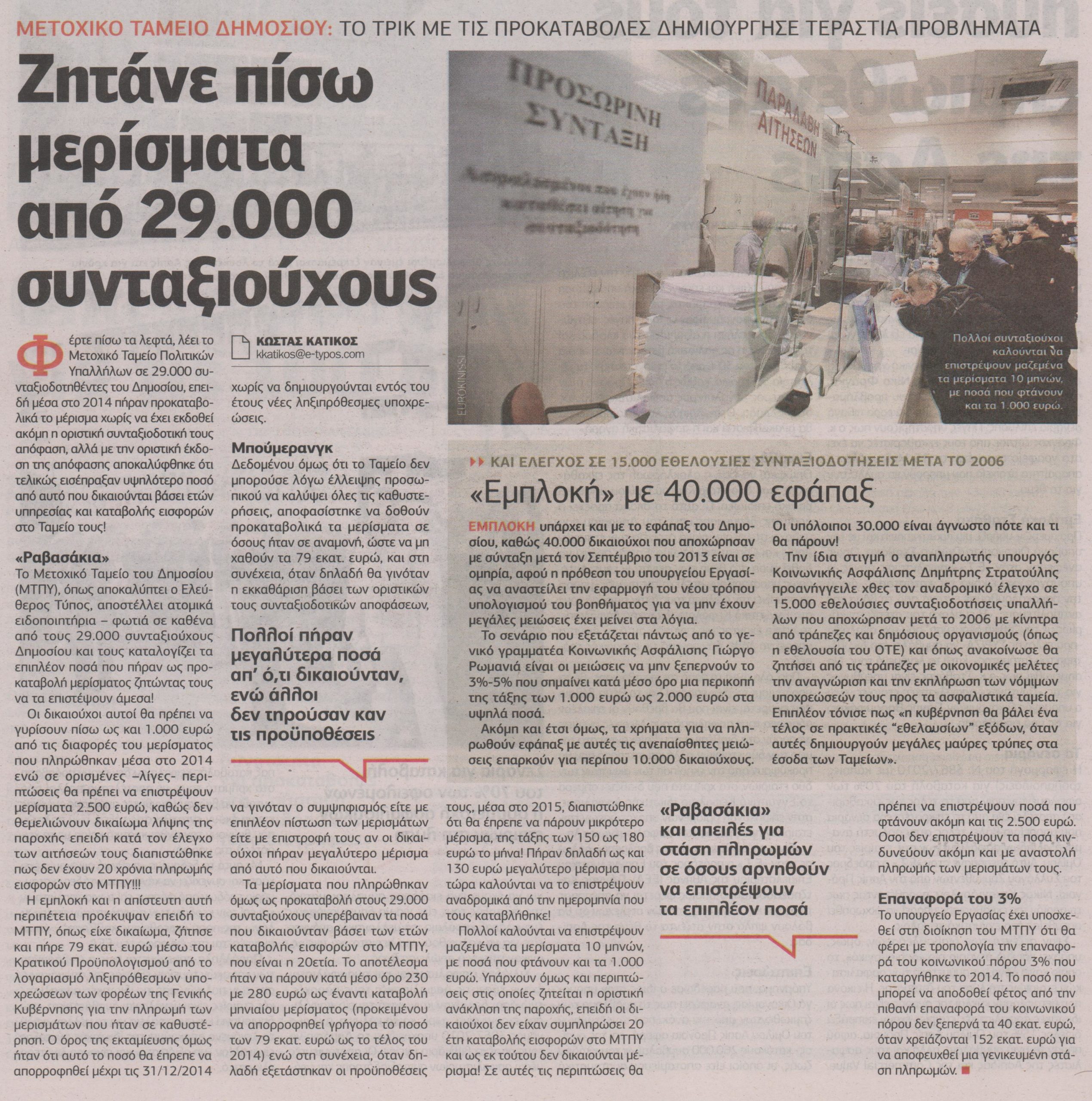 Φέρτε πίσω τα λεφτά, λέει το Μετοχικό Ταμείο Πολιτικών Υπαλλήλων σε 29.000 συνταξιοδοτηθέντες του Δημοσίου, επειδή μέσα στο 2014 πήραν προκαταβολικά το μέρισμα χωρίς να έχει εκδοθεί ακόμη η οριστική συνταξιοδοτική τους απόφαση αλλά με την οριστική έκδοση της απόφασης αποκαλύφθηκε ότι τελικώς εισέπραξαν υψηλότερο ποσό από αυτό που δικαιούται βάσει ετών υπηρεσίας και καταβολής εισφορών στο Ταμείο τους.