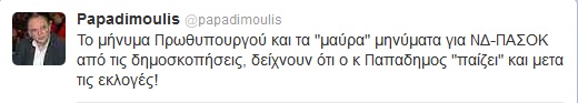 Ο βουλευτής του ΣΥΡΙΖΑ Δημήτρης Παπαδημούλη είδε με άλλη ματιά το μήνυμα του Πρωθυπουργού και τις τελευταίες δημοσκοπήσεις.Συγκεκριμένα έγραψε στο twitter ότι “το μήνυμα Πρωθυπουργού και τα ‘μαύρα’ μηνύματα για ΝΔ-ΠΑΣΟΚ από τις δημοσκοπήσεις, δείχνουν ότι ο κ. Παπαδημος “παίζει” και μετά τις εκλογές!”, εννοώντας ουσιαστικά ότι είναι ανοιχτό το ενδεχόμενο ο Λουκάς Παπαδήμος να είναι πρωθυπουργός και μετά τις εκλογές.