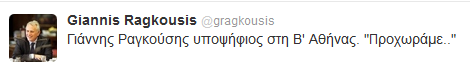 Ο αναπληρωτής υπουργός Άμυνας Γιάννης Ράγκουσης ανακοίνωσε πριν από λίγο στο Twitter την υποψηφιότητα στην Β’ Περιφέρεια Αθήνας. “Γιάννης Ραγκούσης υποψήφιος στη Β’ Αθήνας. “Προχωράμε”, έγραψε χαρακτηριστικά μετά την προκήρυξη τον εκλογών για την Κυριακή 6 Μαίου.