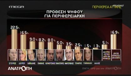 Στην Περιφέρεια της Αττικής, στην πρόθεση ψήφου προηγείται ο Γιάννης Σγουρός με 22,5% έναντι της Ρένας Δούρου που έχει ποσοστό 16,5%. Ακολουθούν οι :Παύλος Χαϊκάλης με 9%, Θανάσης Παφίλης με 8,2%, Γιώργος Κουμουτσάκος με 8% και Ηλίας Παναγιώταρος με 5%.