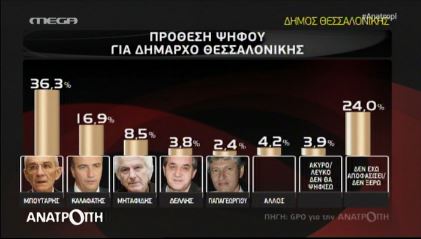 Στο δήμο της Θεσσαλονίκης, στην πρόθεση ψήφου για τον α’ γύρο των εκλογών προηγείται ο Γιάννης Μπουτάρης με 36,3% έναντι του Σταύρου Καλαφάτη με 16,9%. Ακολουθούν οι: Τ. Μηταφίδης με 8,5%, Γ. Δελλής με 3,8% και Χ. Παπαγεωργίου με 2,4%.