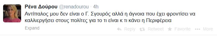 Αντιπαλός μου δεν είναι ο Σγουρός, έγραψε η υποψήφια Περιφερειάρχης Αττικής Ρένα Δούρου στο λογαριασμό της στο Twitter.