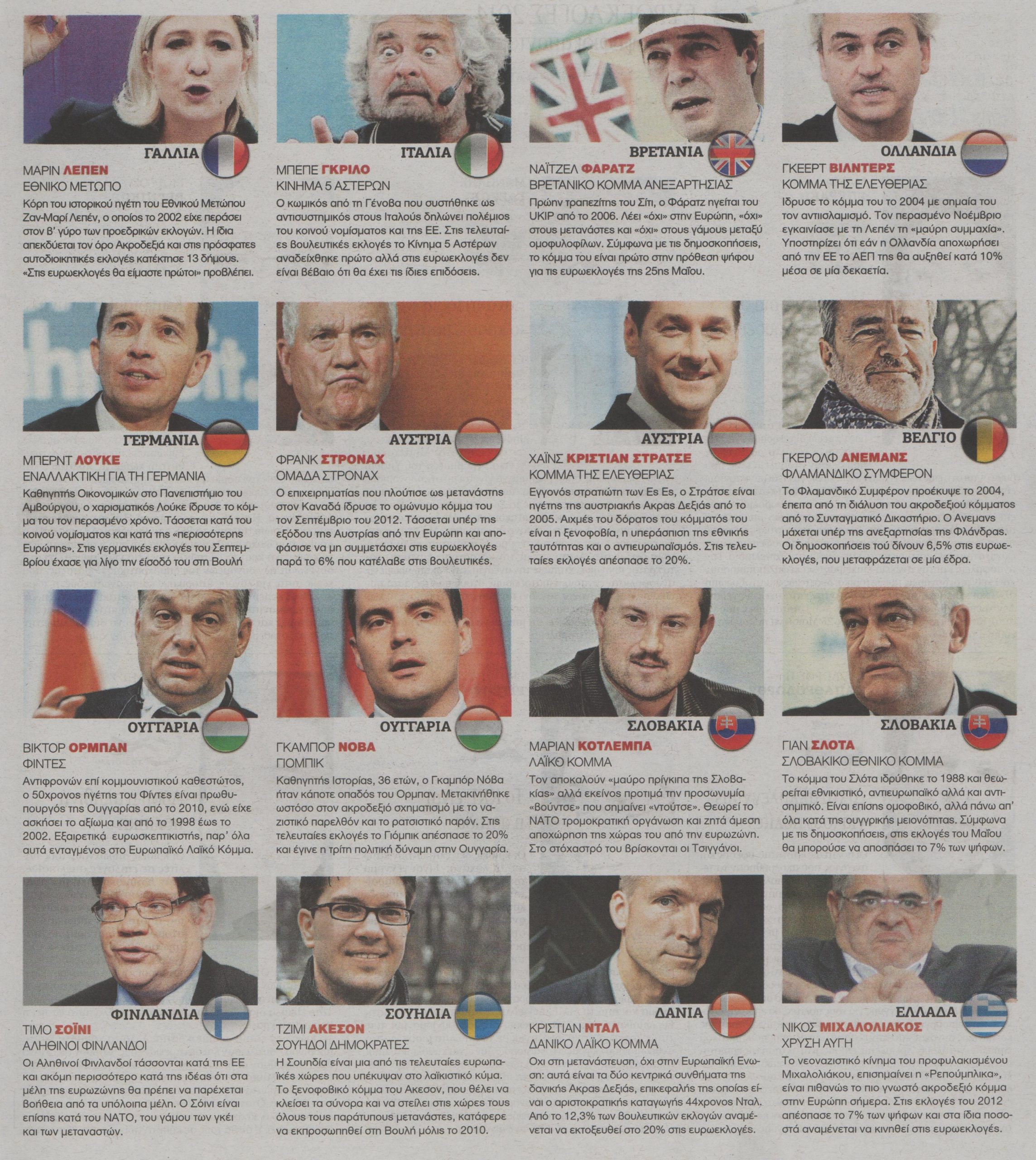 Σημαίνει επίσης ότι από τις κάλπες που θα στηθούν στα 28 κράτη-μέλη της Ευρωπαϊκής Ένωσης θα βγει ενισχυμένο ένα ετερόκλητο κίνημα γενικευμένης διαμαρτυρίας, στο οποίο περιλαμβάνονται τόσο το ακροδεξιό Εθνικό Μέτωπο της Μαρί Λεπέν και το εθνικιστικό UKIP του Νάιτζελ Φάρατζ, όσο και το λαϊκιστικό κίνημα του Μπέπε Γκρίλο.