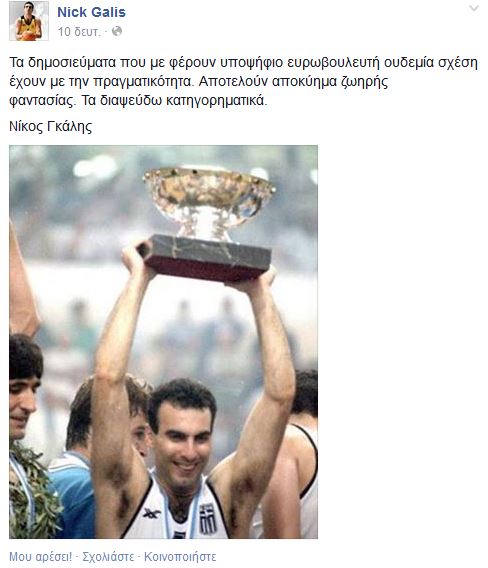 Ο Νίκος Γκάλης διέψευσε μέσω Facebook τα δημοσιεύματα που τον θέλουν υποψήφιο ευρωβουλευτή. “Τα δημοσιεύματα που με φέρουν υποψήφιο ευρωβουλευτή ουδεμία σχέση έχουν με την πραγματικότητα. Αποτελούν αποκύημα ζωηρής φαντασίας. Τα διαψεύδω πραγματικά”, έγραψε ο θρύλος του ελληνικού μπάσκετ.