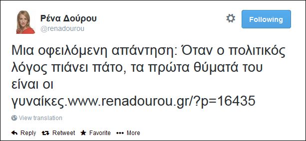 Με σχόλιο που ανήρτησε στην προσωπική της ιστοσελίδα και αναδημοσίευσε στον προσωπικό της λογαριασμό στο twitter απαντάει η Ρένα Δούρου στις δηλώσεις του Θεόδωρου Πάγκαλου στον ραδιοφωνικό σταθμό «Βήμα FM».