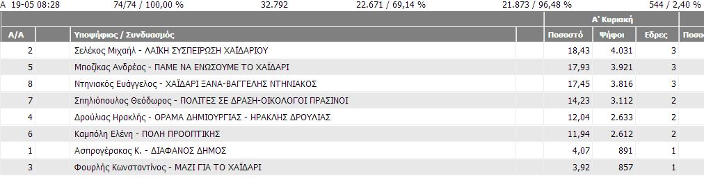 Για τον συγκεκριμένο δήμο η μάχη κρίθηκε στα όρια, καθώς όπως θα δείτε αναλυτικά στον πίνακα, ο συνδυασμός “Χαϊδάρι Ξανά” με επικεφαλής τον Βαγγέλη Ντηνιακό και ο συνδυασμός “Πάμε να ενώσουμε το Χαϊδάρι”, με επικεφαλής τον Ανδρέα Μποζίκα, είχαν διαφορά μόλις 105 ψήφους, ενώ στην πρώτη θέση, βρέθηκε ο συνδυασμός του Μιχάλη Σελέκου με διαφορά 215 ψήφων από τον τρίτο.