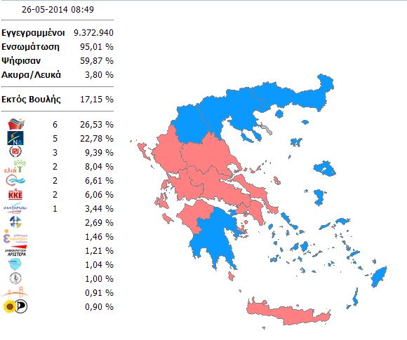 Δείτε πως διαμορφώνεται το εκλογικό αποτέλεσμα σε όλες τις περιφέρειες της Ελλάδας, με την ενσωμάτωση να αγγίζει το 95%.