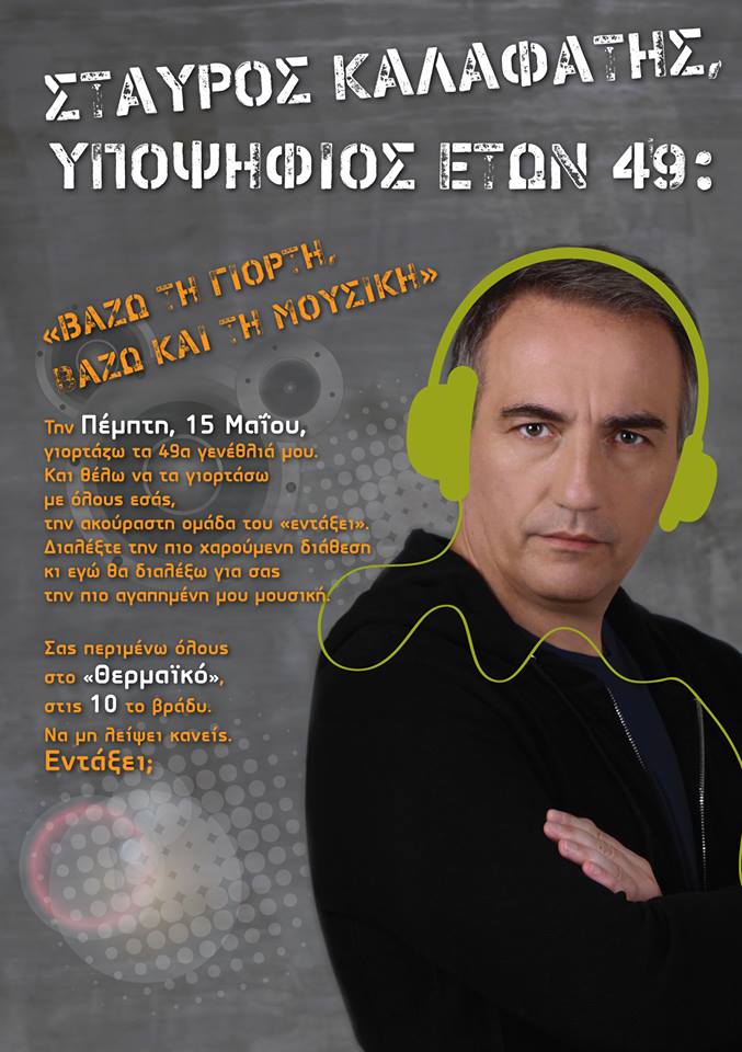 Με έναν πρωτότυπο τρόπο επέλεξε να γιορτάσει τα 49α γενέθλια του ο Σταύρος Καλαφάτης. Ο υποψήφιος δήμαρχος Θεσσαλονίκης με την Νέα Δημοκρατία διοργανώνει αύριο πάρτι γενεθλίων σε νυχτερινό μαγαζί της συμπρωτεύουσας στο οποίο χρέη dj θα εκτελέσει ο ίδιος.
