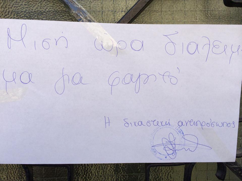Μάλιστα, φρόντισαν να θυροκολλήσουν και τη σχετική, αυτοσχέδια ανακοίνωση που βλέπετε στη φωτογραφία.