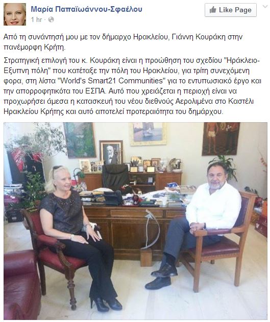 Μία φωτογραφία από την συνάντησή της με τον δήμαρχο Ηρακλείου, Γιάννη Κουράκη, «ανέβασε» στο facebook, η υποψήφια ευρωβουλευτής της «Ελιάς» Μαρία Παπαϊωάννου-Σφαέλου.