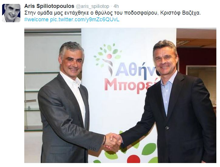 «Στην ομάδα μας εντάχθηκε ο θρύλος του ποδοσφαίρου, Κριστόφ Βαζέχα», έγραψε ο Άρης Σπηλιωτόπουλος στο twitter.