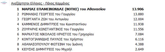 Το απόλυτο ντέρμπι βρίσκεται σε εξέλιξη για μία θέση στο ευρωκοινοβούλιο. Οι Ανεξάρτητοι Έλληνες κερδίζουν μια θέση στην ευρωβουλή την οποία διεκδικούν ο Νότης Μαριάς και ο Γιώργος Ρωμανιάς. Μέχρι χθες το βράδυ είχε σαφές προβάδισμα ο κ. Μαριάς, ωστόσο έγινε η ανατροπή και στην πρώτη θέση ανέβηκε ο Γιώργος Ρωμανιάς. Σήμερα, κεφάλι έχει πάρει και πάλι ο Νότης Μαριάς. Ωστόσο, η μεταξύ τους διαφορά είναι οριακή οπότε όλα είναι ανοιχτά. Αυτή την ώρα, με καταμετρημένο το 34,51% ο κ. Μαριάς έχει 13.906 σταυρούς ενώ ο κ. Ρωμανιάς 13.880. Δηλαδή, μόλις 26 σταυρούς διαφορά.