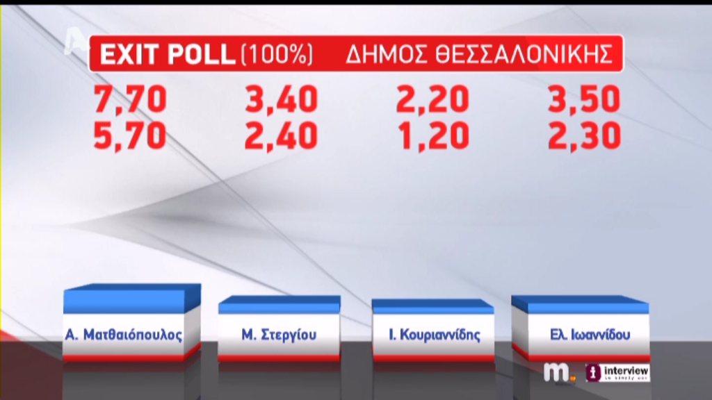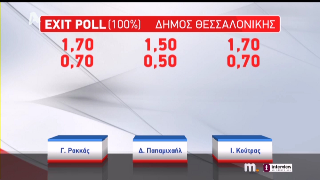 Προβάδισμα για τον δήμο Θεσσαλονίκης του Γιάννη Μπουτάρη έναντι του Σταύρου Καλαφάτη με έντεκα μονάδες διαφορά, δείχνει το exit poll που διενήργησε για λογαριασμό του τηλεοπτικού σταθμού TV Μακεδονία, η εταιρεία «Interview» σε δείγμα 2.000 ατόμων.
