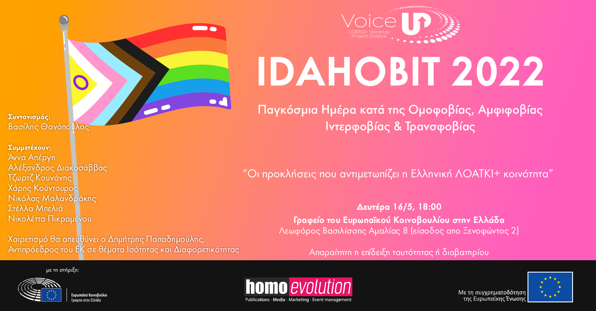 Ανοικτή εκδήλωση στο πλαίσιο των δράσεων για την Παγκόσμια ημέρα κατά της ομοφοβίας, αμφιβοβίας, ιντερφοβίας και τρανσφοβίας (17/5) συνδιοργανώνει με την ομάδα υλοποίησης του έργου LGBTQI+ Voice Up: Project Greece, το Γραφείο του Ευρωπαϊκού Κοινοβουλίου στην Ελλάδα τη Δευτέρα 16 Μαΐου στις 18:00.
