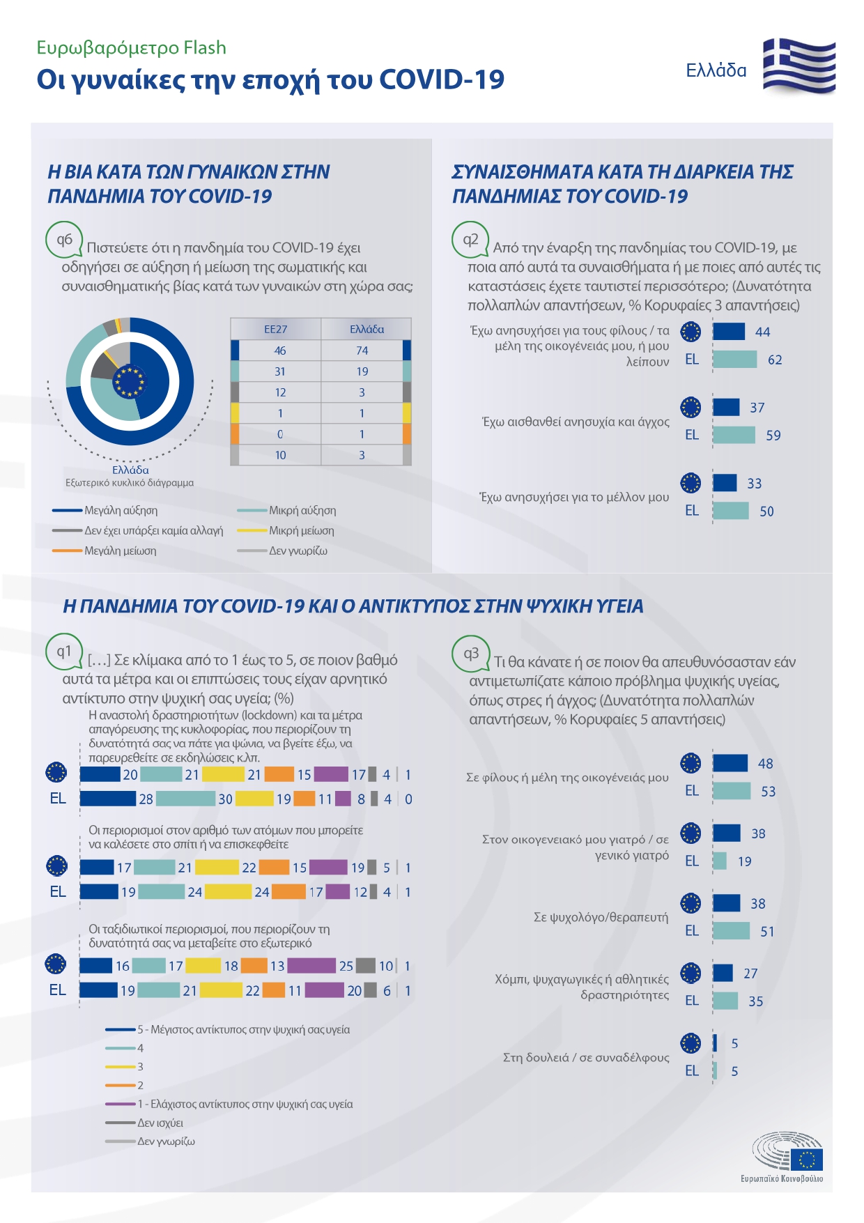 Τρεις στις τέσσερις γυναίκες (77%) στην ΕΕ πιστεύουν ότι η πανδημία COVID-19 έχει οδηγήσει σε αύξηση της σωματικής και ψυχολογικής βίας κατά των γυναικών. Σε 25 από τις 27 χώρες της ΕΕ (εκτός δηλαδή από τη Φινλανδία και την Ουγγαρία), το ποσοστό αυτό υπερβαίνει το 50%, με τα ποσοστά να φτάνουν το 93% στην Ελλάδα και το 90% στην Πορτογαλία.
