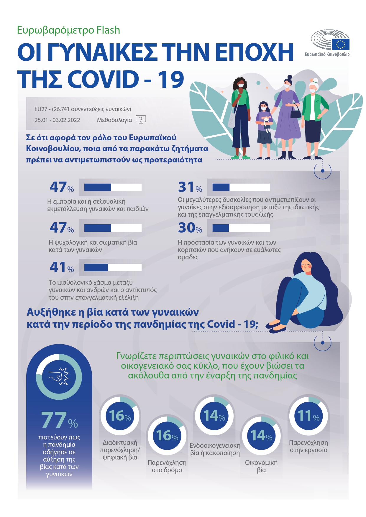Ενόψει της Παγκόσμιας Ημέρας της Γυναίκας στις 8 Μαρτίου, το Ευρωπαϊκό Κοινοβούλιο ζήτησε να διεξαχθεί ειδική έρευνα για πρώτη φορά μόνο μεταξύ των γυναικών της Ευρώπης, προκειμένου να διαπιστωθούν οι επιπτώσεις της πανδημίας σε διάφορους τομείς της ζωής τους.