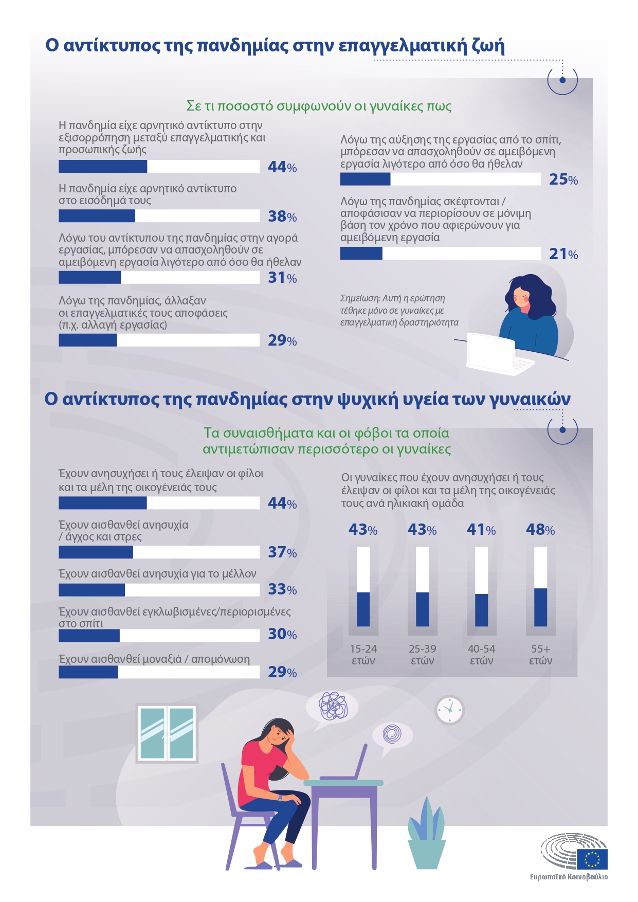 Υπάρχει μια σταθερή άποψη μεταξύ των γυναικών ότι τα μέτρα που πάρθηκαν κατά της πανδημίας είχαν σημαντικό αντίκτυπο στην ψυχική τους υγεία, κατά 41% σε όλη την Ευρώπη, αισθητά περισσότερο στην Ελλάδα, κατά 58%.