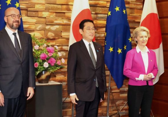 Όπως είπε η πρόεδρος της Κομισιόν ύστερα από τις συνομιλίες που είχε μαζί με τον πρόεδρο του Ευρωπαϊκού Συμβουλίου Σαρλ Μισέλ, με τον Ιάπωνα πρωθυπουργό Φουμίο Κισίντα, η Ρωσία «είναι σήμερα η πιο άμεση απειλή για την παγκόσμια τάξη, με τον βάρβαρο πόλεμό της εναντίον της Ουκρανίας και την ανησυχητική συμφωνία της με την Κίνα». Οι δύο κορυφαίοι Ευρωπαίοι αξιωματούχοι βρίσκονται σήμερα στο Τόκιο για τον ετήσιο κύκλο συνομιλιών Ιαπωνίας-ΕΕ, που διεξάγεται αυτή τη φορά μεσούσης της ρωσο-ουκρανικής σύρραξης και με φόντο τις αυξανόμενες ανησυχίες για τις στρατιωτικές φιλοδοξίες της Κίνας.