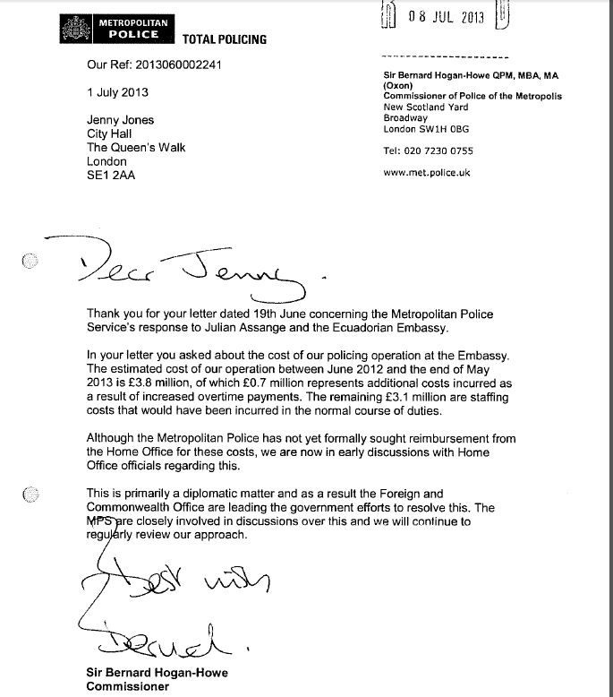 Σύμφωνα με μια νέα επιστολή από την Μητροπολιτική Αστυνομία του Λονδίνου δαπανά κατά μέσο όρο £ 10.982 ανά ημέρα για να περικυκλώνει την πρεσβεία του Εκουαδόρ όπου έχει καταφύγει ο Τζούλιαν Ασάνζ για τις τελευταίες 386 ημέρες.