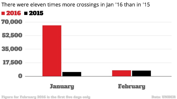 Σύμφωνα με τα επίσημα στοιχεία της Ύπατης Αρμοστείας των Ηνωμένων Εθνών για τους Πρόσφυγες, η έρευνα αποκαλύπτει επίσης πως το πρώτο πενθήμερο του Φεβρουαρίου έχουν διασχίσει τη Μεσόγειο περισσότεροι πρόσφυγες από όσοι το επιχείρησαν ολόκληρο τον Φεβρουάριο του 2015.