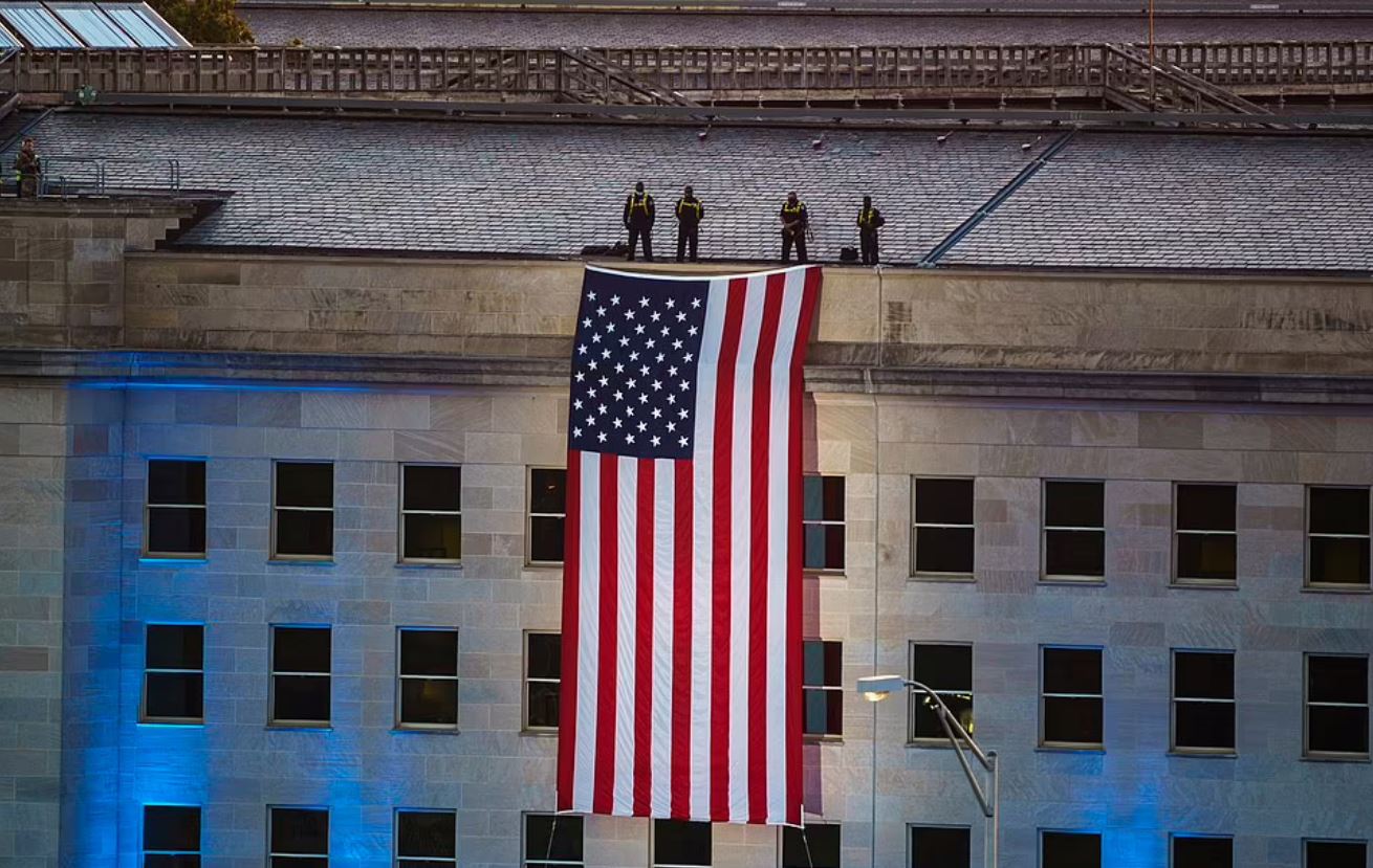 Από το Πεντάγωνο κρέμασαν μία τεράστια αμερικανική σημαία, σηματοδοτώντας την τρομοκρατική επίθεση που συνέβη κατά του κτιρίου.