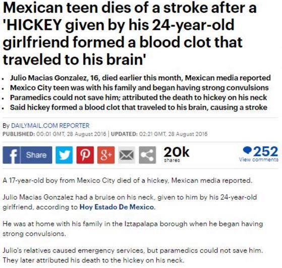 Το φιλί της κοπέλας του 17χρονου Julio Macias Gonzalez από το Μεξικό αποδείχτηκε θανάσιμο καθώς το ρούφηγμα στο λαιμό του προκάλεσε θρόμβωση και εν συνεχεία εγκεφαλικό.