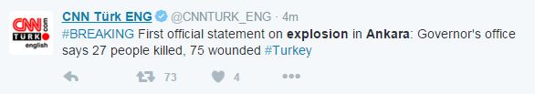 Σύμφωνα με την πρώτη επίσημη ανακοίνωση, 27 είναι οι νεκροί και 75 οι τραυματίες από την έκρηξη στο κέντρο της Άγκυρας, όπως μεταδίδει το CNN Turk.