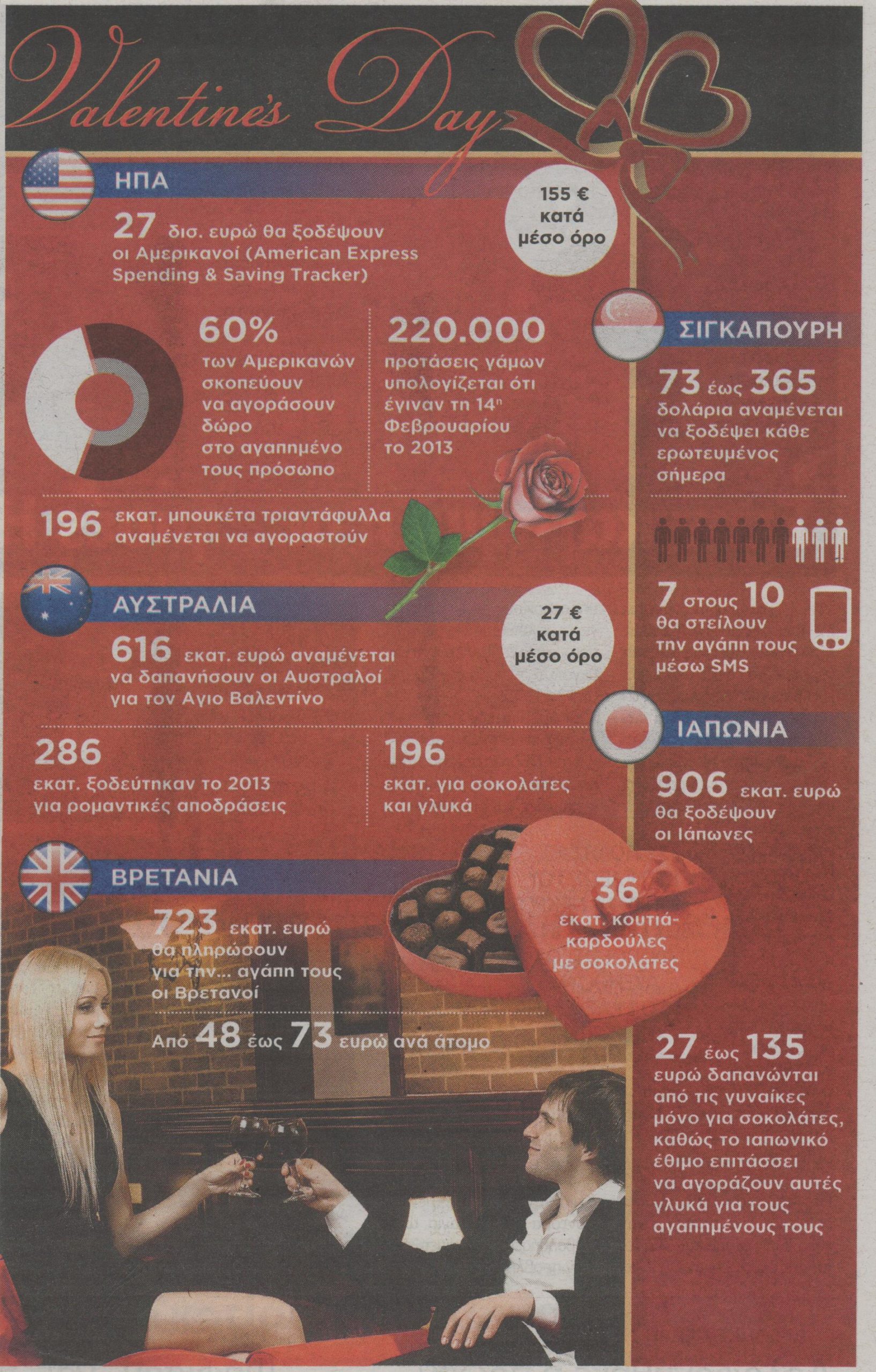 Μπορεί το 54% του παγκόσμιου πληθυσμού να πιστεύει ότι η ημέρα του Αγίου Βαλεντίνου είναι μια άνευ ουσίας εμπορική γιορτή, παρ΄ όλα αυτά οι ερωτευμένοι μόνο σε ΗΠΑ, Αυστραλία, Βρετανία και Ιαπωνία αναμένεται να δαπανήσουν περισσότερα από 29 δισ. ευρώ για την αγάπη!