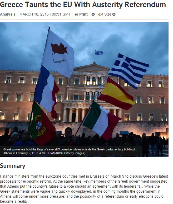Όπως σημειώνεται, «οι υπουργοί Οικονομικών της ευρωζώνης συναντήθηκαν στις 9 Μαρτίου στις Βρυξέλλες για να συζητήσουν τις τελευταίες προτάσεις της Ελλάδας για τις οικονομικές μεταρρυθμίσεις. Ταυτόχρονα, υψηλόβαθμα μέλη της ελληνικής κυβέρνησης δήλωναν ότι η Αθήνα θα θέσει σε ψηφοφορία το μέλλον της χώρας εάν δεν επιτευχθεί συμφωνία με τους πιστωτές της χώρας. Μολονότι οι δηλώσεις των Ελλήνων αξιωματούχων ήταν αόριστες και γρήγορα υποβαθμίστηκαν, τους επόμενους μήνες η ελληνική κυβέρνηση θα δεχτεί μεγαλύτερες πιέσεις και γι’ αυτό τον λόγο θα μπορούσε να καταστεί πραγματικότητα το ενδεχόμενο ενός δημοψηφίσματος ή πρόωρων εκλογών».