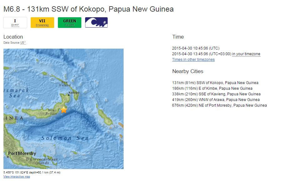 Σεισμός μεγέθους 6,8 βαθμών της κλίμακας Ρίχτερ σημειώθηκε, σήμερα, ανοιχτά των ακτών της Παπούας Νέας Γουινέας, σε απόσταση 154 χιλιομέτρων νότια της πόλης Ραμπάουλ, σύμφωνα με το Αμερικανικό Ινστιτούτο Γεωφυσικής (USGS).