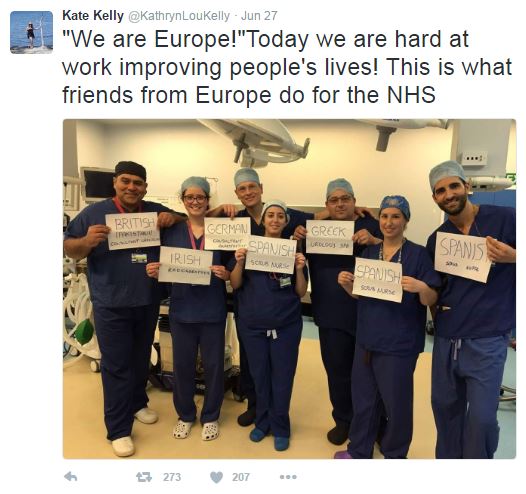 Στη φωτογραφία που δημοσίευσε στον λογαριασμό της στο Twitter η Kate Kelly απεικονίζονται 7 γιατροί μέσα στο χειρουργείο να κρατούν χαρτιά, στα οποία έχουν γράψει τη χώρα καταγωγής τους και την ειδικότητα τους. Είναι τρεις νοσηλευτές από την Ισπανία, μία ακτινολόγος από την Ιρλανδία, ένας αναισθησιολόγος από τη Γερμανία, ένας ουρολόγος από την Ελλάδα και ένας Βρετανός πακιστανικής καταγωγής, ουρολόγος.