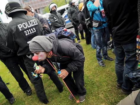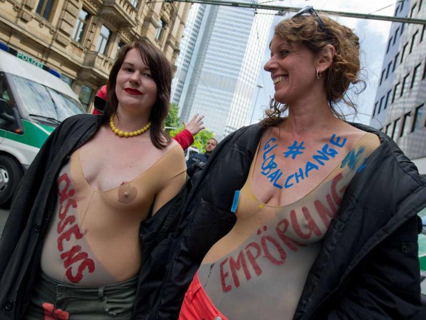 «Πεινάτε; Φάτε έναν τραπεζίτη», έγραφε ένα από τα πανό που είχαν αναρτήσει οι διαδηλωτές έξω απο τον ουρανοξύστη Messeturm, όπου βρίσκονται τα γραφεία της Goldman Sachs ενώ μερικά από τα συνθήματα που ακούγονταν ήταν:”Χτυπήστε στην καρδιά του κτήνους! Επιτεθείτε στα κέντρα του καπιταλισμού! Ο καπιταλισμός σημαίνει πόλεμο! Πλημμυρείστε τη Φρανκφούρτη!”