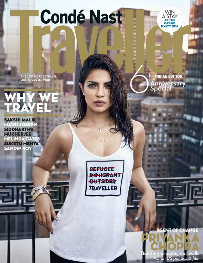 Η 34χρονη Chopra, φωτογραφήθηκε πρόσφατα για το εξώφυλλο του περιοδικού Conde Nast Traveller, φορώντας ένα λευκό μλπουζάκι το οποίο έχει διεγραμμένες τις λέξεις «πρόσφυγας», «μετανάστης» και «ξενόφερτος» με τη λέξη «ταξιδιώτης» στο κάτω μέρος.