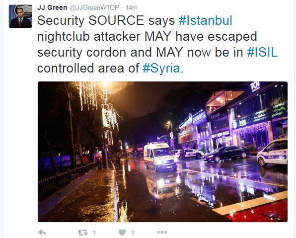 «Πηγή από την Ασφάλεια είπε ότι ο δράστης της επίθεσης στο νάιτ καλμπ της Κωνσταντινούπολης μπορεί να ξέφυγε των τουρκικών αρχών και να βρίσκεται σε περιοχή της Συρίας που ελέγχεται από το Ισλαμικό Κράτος», έγραψε χαρακτηριστικά στο λογαριασμό του στο Twitter.