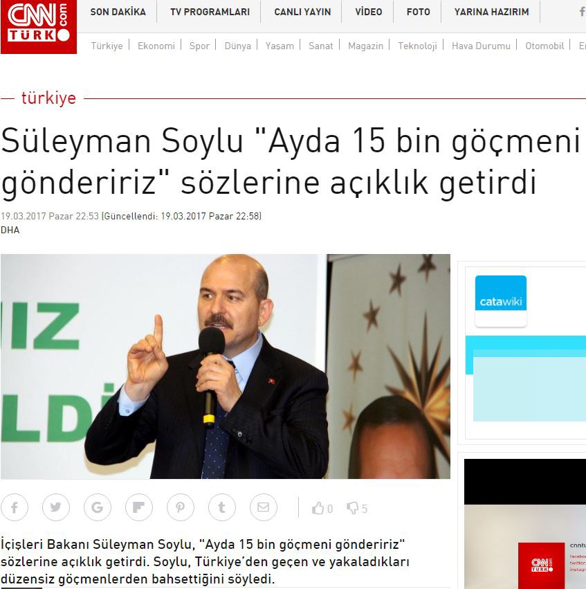 Προκλητικός εμφανίστηκε, νωρίτερα σήμερα, ο υπουργός Εσωτερικών της Τουρκίας Σουλεϊμάν Σοϊλού, ο οποίος την περασμένη εβδομάδα απείλησε ότι η χώρα του ενδέχεται να αφήνει να φεύγουν για την Ευρώπη 15.000 άνθρωποι.«Δεν εννοούσα πρόσφυγες, αλλά παράνομους μετανάστες» δήλωσε ο Σοϊλού, υποστηρίζοντας ότι αναφερόταν σε όσους προσπαθούν ούτως ή άλλως να φτάσουν σε άλλες χώρες δια θαλάσσης.Κατηγόρησε, μάλιστα, την αντιπολίτευση και τα ΜΜΕ στην Τουρκία ότι διαστρέβλωσαν τα λόγια του για χάρη της αντιπολίτευσης μιλώντας στην επαρχία Εντιρνέ το βράδυ της Κυριακής.«Τότε γιατί ήμαστε στην Τζαραμπλούς (σ.σ. στη Συρία); Γίναμε ασπίδα προστασίας για 30.000 ανθρώπους εκεί» είπε ο Σοϊλού.Σύμφωνα με τον ίδιο, η Τουρκία ανά μήνα το 2016 συλλάμβανε 15.000 μετανάστες που προσπαθούσαν να περάσουν από τη θάλασσα σε άλλες χώρες.«Εμείς τηρήσαμε τη συμφωνία, αλλά η Ευρώπη δεν τήρησε ούτε ένα άρθρο. Δεν έχουν την πρόθεση να το κάνουν γιατί το μόνο που κάνουν είναι να υπολογίζουν τα νούμερα μέρα και νύχτα», κατέληξε ο Σοϊλού.