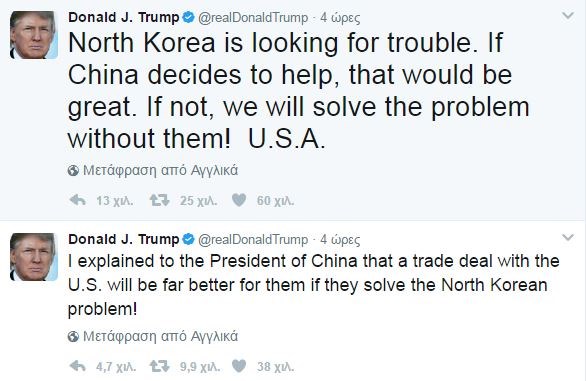 Εντείνεται η διαμάχη μεταξύ ΗΠΑ και Βόρειας Κορέας, με τον Αμερικανό Πρόεδρο Ντόναλντ Τραμπ να αναφέρει ότι η Βόρεια Κορέα «πάει γυρεύοντας» και τα ΜΜΕ της Πιονγκ Γιανγκ να απειλούν με πυρηνική επίθεση σε περίπτωση που προκληθούν.Προειδοποιητικό μήνυμα στη Βόρεια Κορέα, μέσω του λογαριασμού του στο Twitter, έστειλε ο Αμερικανός πρόεδρος Ντόναλντ Τραμπ, καλώντας την Κίνα να βοηθήσει στην αντιμετώπιση του ζητήματος.«Η Βόρεια Κορέα πάει γυρεύοντας. Αν η Κίνα αποφασίσει να βοηθήσει, αυτό θα είναι σπουδαίο. Αν όχι, θα λύσουμε το πρόβλημα χωρίς αυτούς!» έγραψε ο Τραμπ στο Twitter.«Εξήγησα στον πρόεδρο της Κίνας ότι μια εμπορική συμφωνία με τις ΗΠΑ θα ήταν πολύ καλύτερη για αυτούς αν έλυναν το πρόβλημα της Βόρειας Κορέας!» πρόσθεσε.