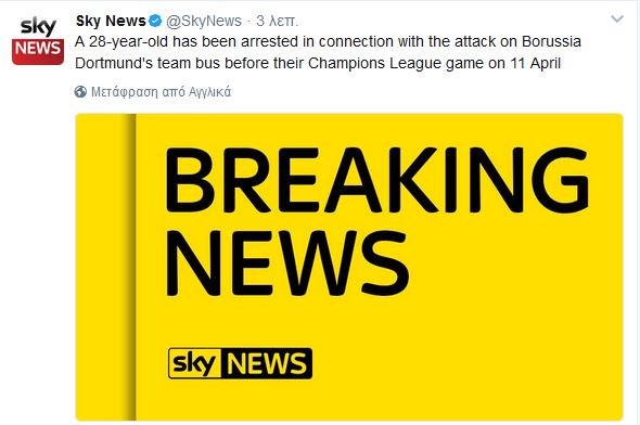 Ένας 28χρονος έχει συλληφθεί ως ύποπτος για την επίθεση στο λεωφορείο της Ντόρτμουντ, λίγο πριν τον αγώνα του Champions League στις 11 Απριλίου.Την είδηση μετέδωσε στο Twitter το Sky News.