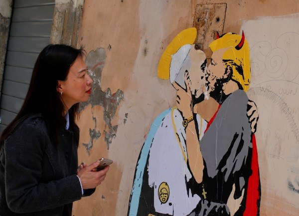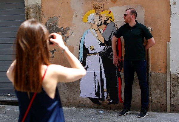 Ο πρόεδρος των ΗΠΑ, Ντόναλντ Τραμπ ετοιμάζεται για την επίσκεψη του στην Ιταλία και τη συνάντηση του με τον Πάπα Φραγκίσκο στο Βατικανό, ωστόσο στη Ρώμη σκανδαλίζει ένα γκράφιτι σε κεντρικό δρόμο που απεικονίζει τους δύο άνδρες να φιλιούνται στο στόμα.