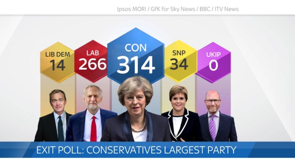 Σύμφωνα με το κοινό κοινό exit poll που πραγματοποίησε η εταιρεία Ipsos για λογαριασμό των BBC, ITV και SKy News, οι Συντηρητικοί της Τερέζα Μέι αναμένεται να εκλέξουν 314 βουλευτές, οι Εργατικοί 266, το Σκωτικό Εθνικό Κόμμα 34 έδρες, οι Φιλελεύθεροι Δημοκράτες 14 έδρες, και οι Πράσινοι 1 έδρα. Το Κόμμα για την Ανεξαρτησία της Βρετανίας (UKIP) φέρεται να μένει εκτός κοινοβουλίου.