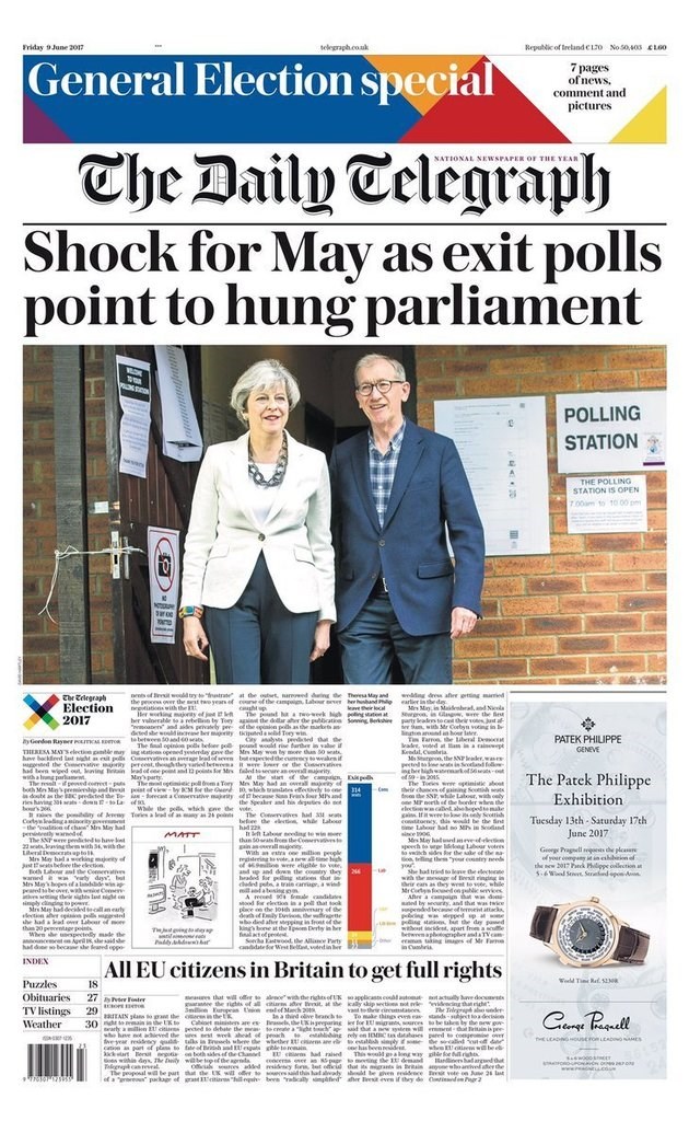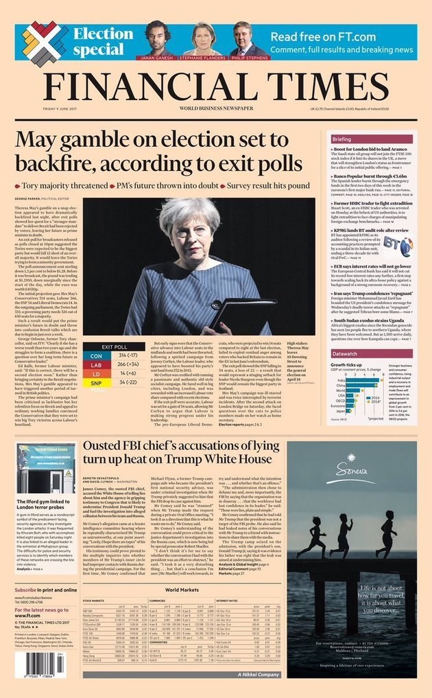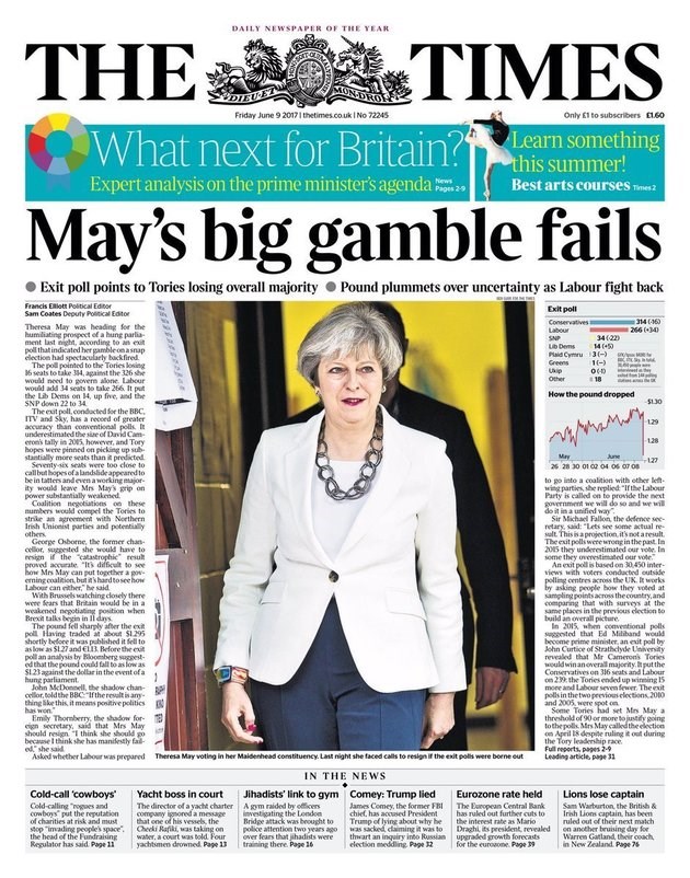 «Το μεγάλο στοίχημα της Μέι απέτυχε», είναι ο πρωτοσέλιδος τίτλος των Times. Η εφημερίδα υπογραμμίζει ότι το όνειρο της πρωθυπουργού να ενισχύσει την πλειοψηφία της «φαίνεται ότι έγινε συντρίμμια».