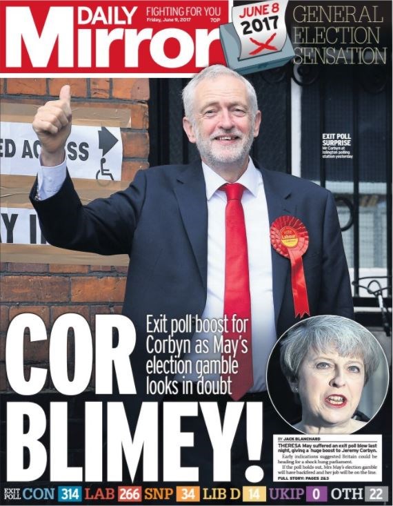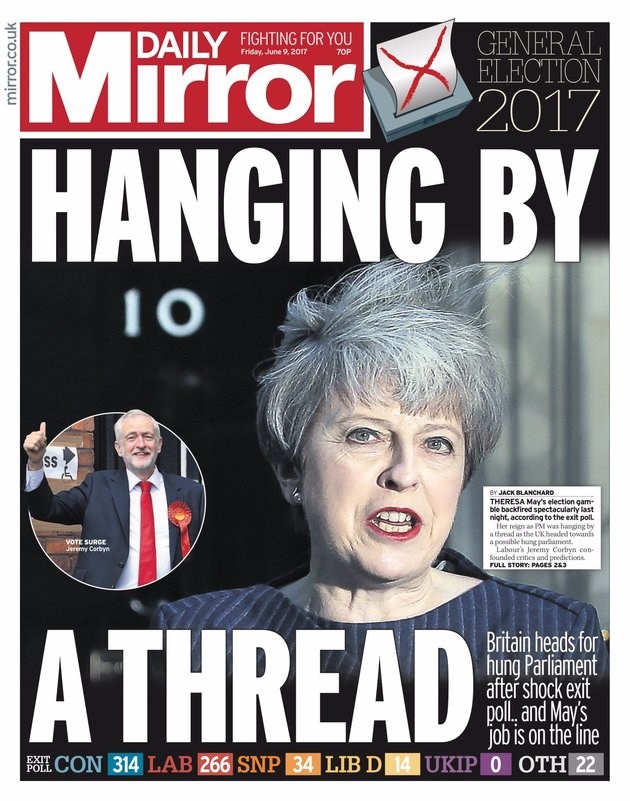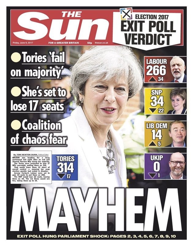 «Mayhem» (χάος), είναι ο τίτλος της Sun, που επιλέγει να παίξει με το όνομα της πρωθυπουργού. Η εφημερίδα κάνει λόγο για «καταστροφή» και φοβάται «έναν συνασπισμό του χάους».