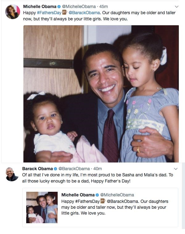 Αφορμή αποτέλεσε η Ημέρα του Πατέρα, με τη Μισέλ Ομπάμα να ανεβάζει στο Twitter φωτογραφία του Μπαράκ Ομπάμα με τις κόρες τους, Μαλία και Σάσα, και δυο γλυκά λόγια.