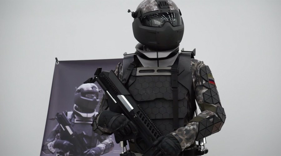 Στο βίντεο που δημοσιεύει το Russia Today, η πρωτότυπη στολή του “στρατιώτη του μέλλοντος” μοιάζει με εμφάνιση του Star Wars.