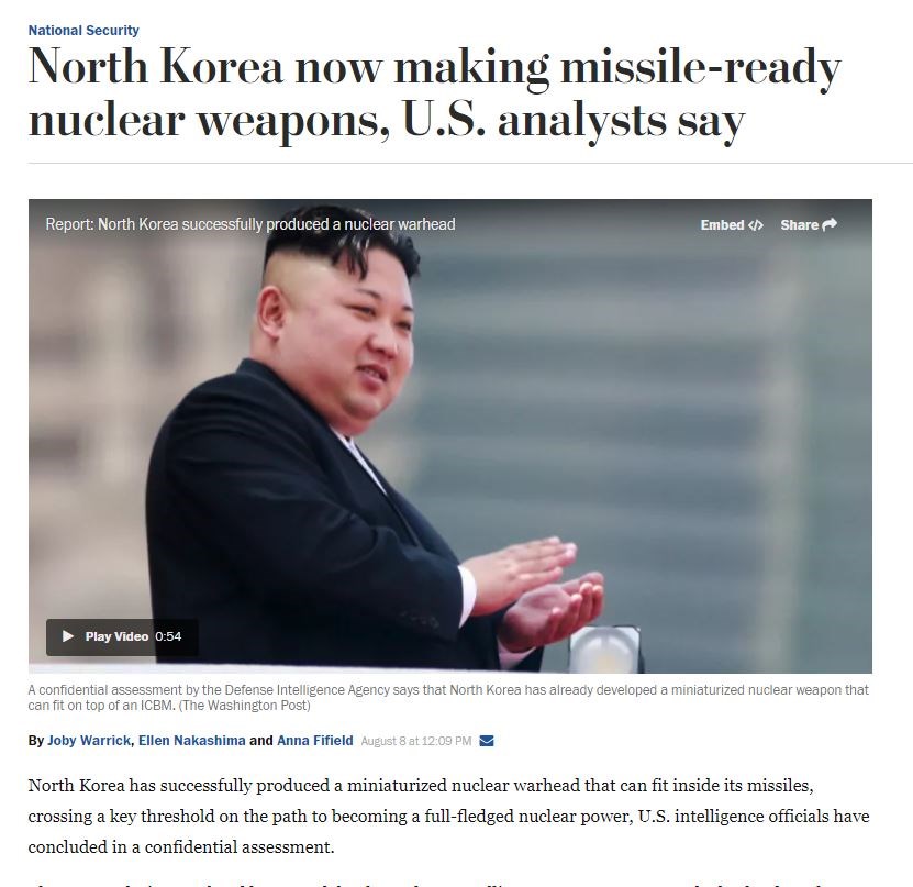 Η Βόρεια Κορέα κατάφερε να ολοκληρώσει με επιτυχία τη σμίκρυνση μιας πυρηνικής κεφαλής προκειμένου να την εφαρμόσει σε έναν από τους διηπειρωτικούς πυραύλους της, σύμφωνα με τα απόρρητα συμπεράσματα εμπειρογνωμόνων των αμερικανικών υπηρεσιών πληροφοριών, που δημοσίευσε σήμερα η εφημερίδα Washington Post.